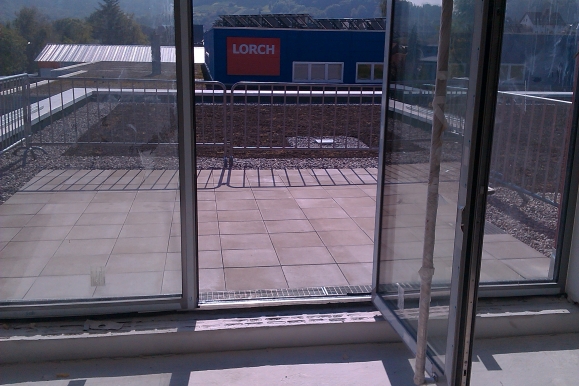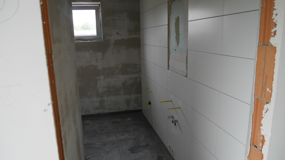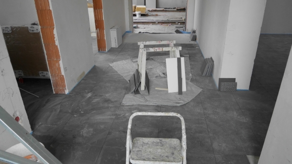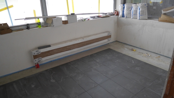 23. August 2015, Esstricharbeiten beendet, Fliesen werden verlegt