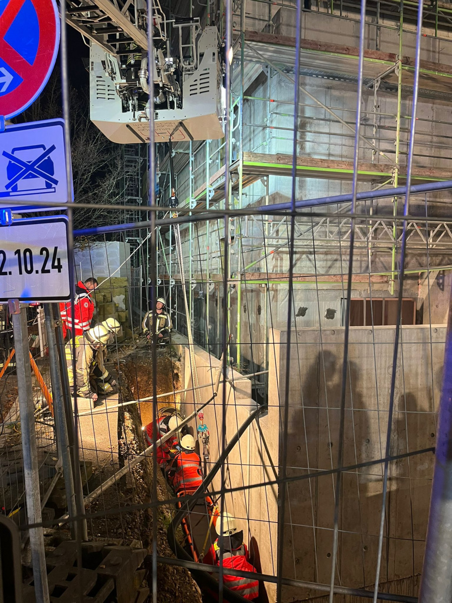 Beim Eintreffen der ersten Einsatzkräfte wurde die Person bereits vom Rettungsdienst in der Baugrube erstversorgt. Aufgrund des Lagebildes alarmierte der Einsatzleiter die Fachgruppe ERHT (Einfache Rettung aus Höhen und Tiefen) nach. Die Einsatzstelle wurde großräumig ausgeleuchtet, der Zugang zum Patienten durch das Entfernen fest verbauter Bauzaunelemente ermöglicht und aufgrund der Unterkühlung der Person diese mittels einem Halogenscheinwerfer der Beleuchtungseinheit gewärmt.