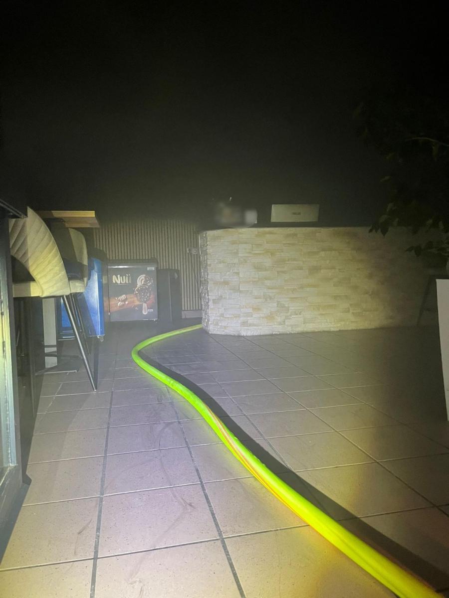 Bei der weiteren Erkundung waren Flammen, die aus den seitlichen Fenstern im Küchenbereich an der Fassade hinaufbrannten, zu erkennen. Aufgrund dieser Lage veranlasste der Einsatzleiter eine Alarmstufenerhöhung sowie die Nachforderung eines dritten Löschfahrzeuges der Abteilung Neckarsulm und ein weiteres Löschfahrzeug der Abteilung Obereisesheim.