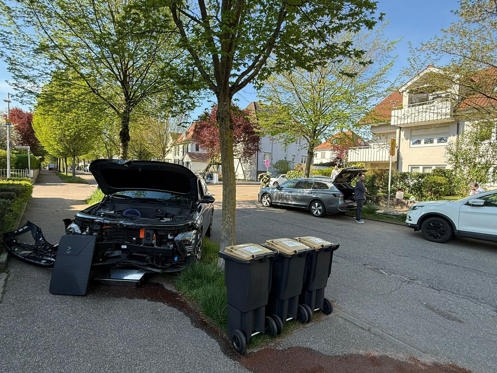 Während der Löscharbeiten ging um 09.45 Uhr ein weiterer Alarm ein. Diesmal wurden auslaufende Betriebsmittel aus einem Pkw nach einem Verkehrsunfall gemeldet. Im Bereich der Friedenstraße/Lerchenstraße kam es zu einem Zusammenstoß zwischen zwei Pkws. Die Einsatzkräfte schalteten die Fahrzeuge stromlos, sicherten die Einsatzstelle ab und nahmen die auslaufenden Betriebsmittel mit Ölbindemittel auf. Anschließend wurden beide Einsatzstellen der Polizei übergeben.