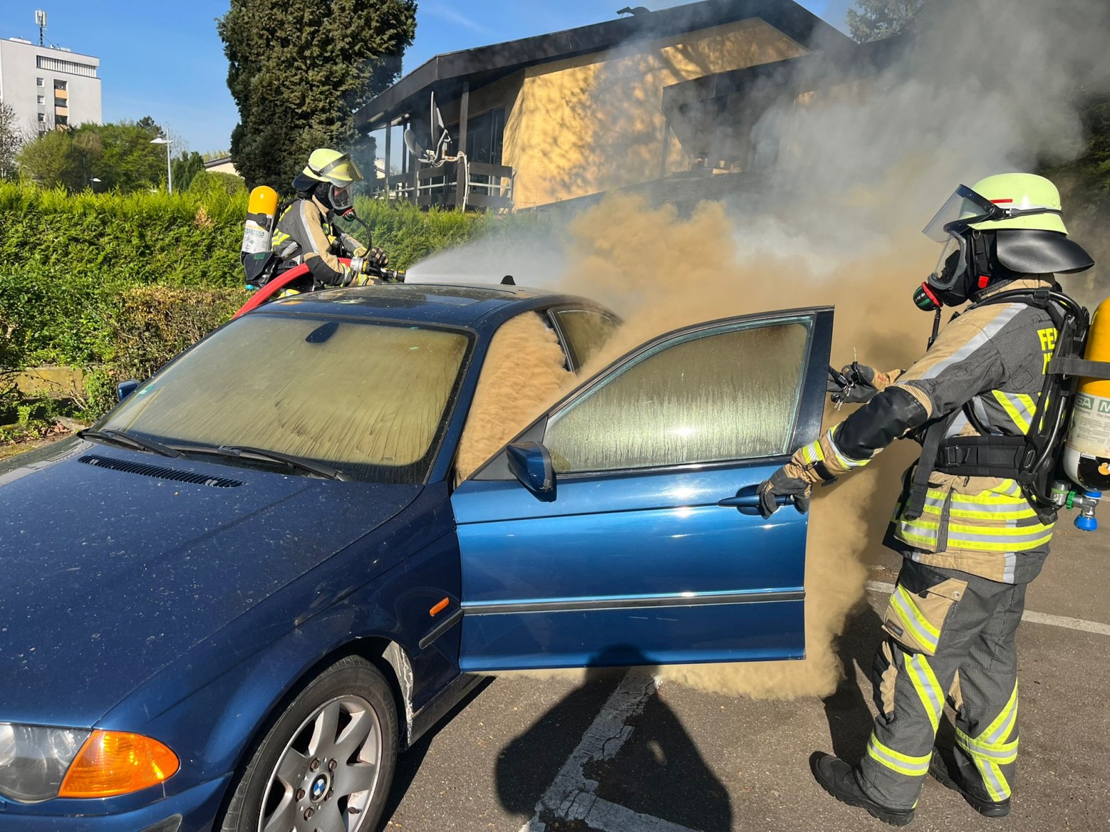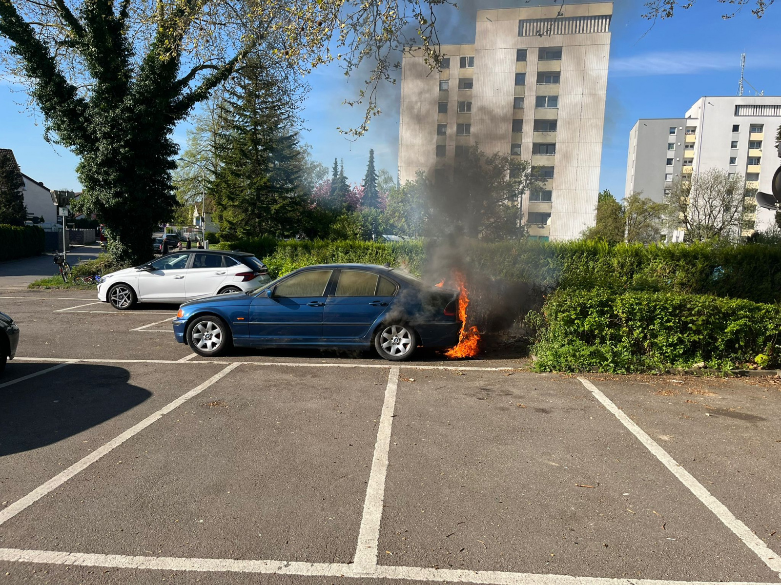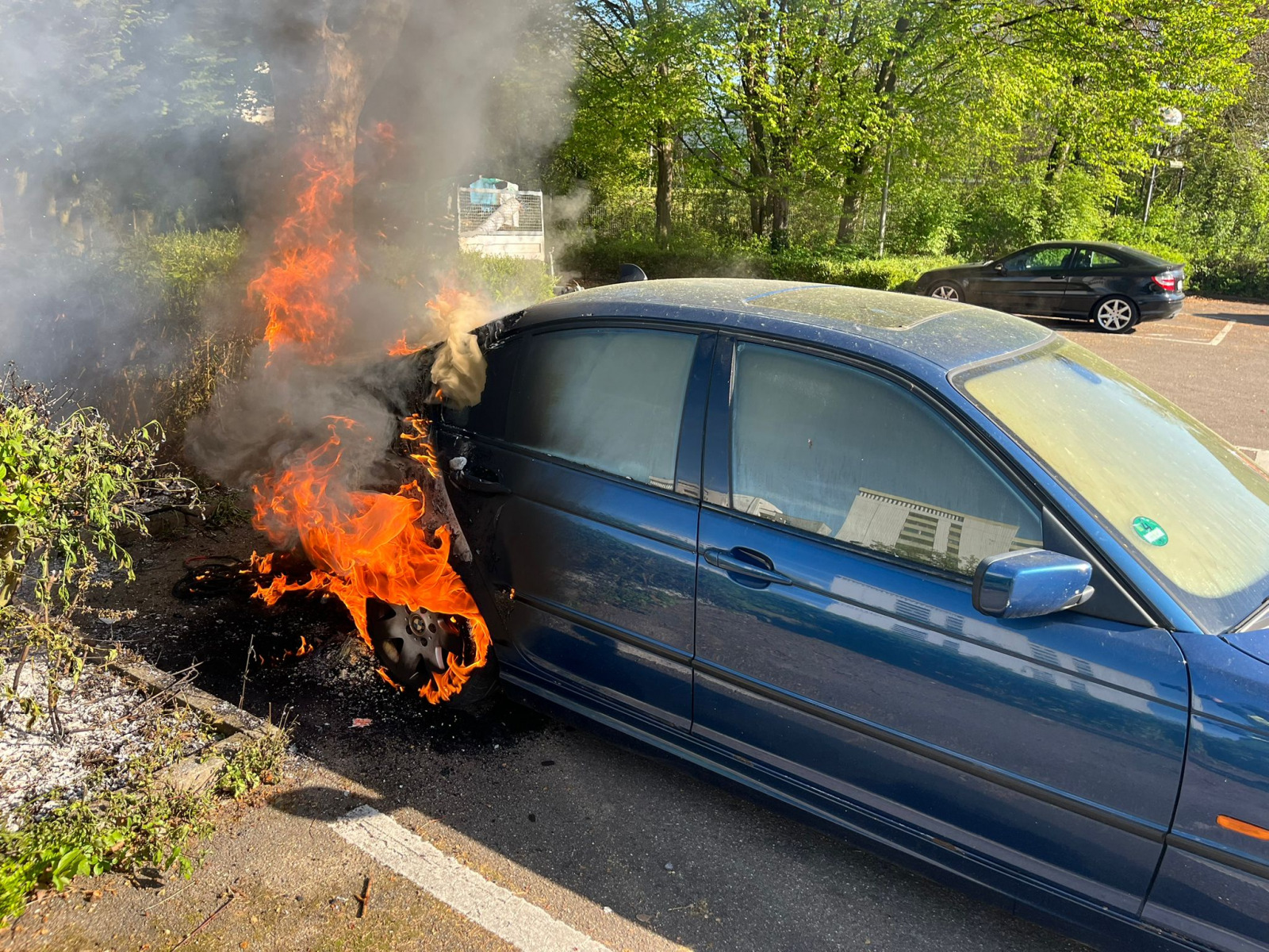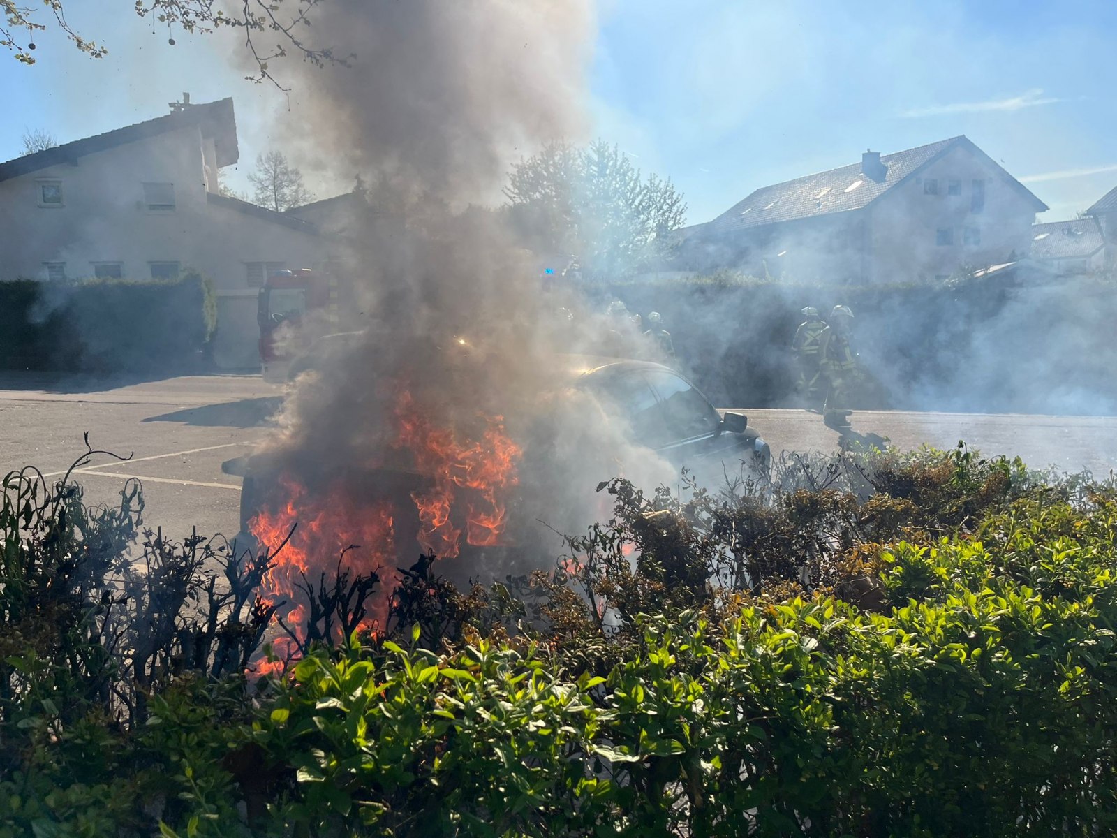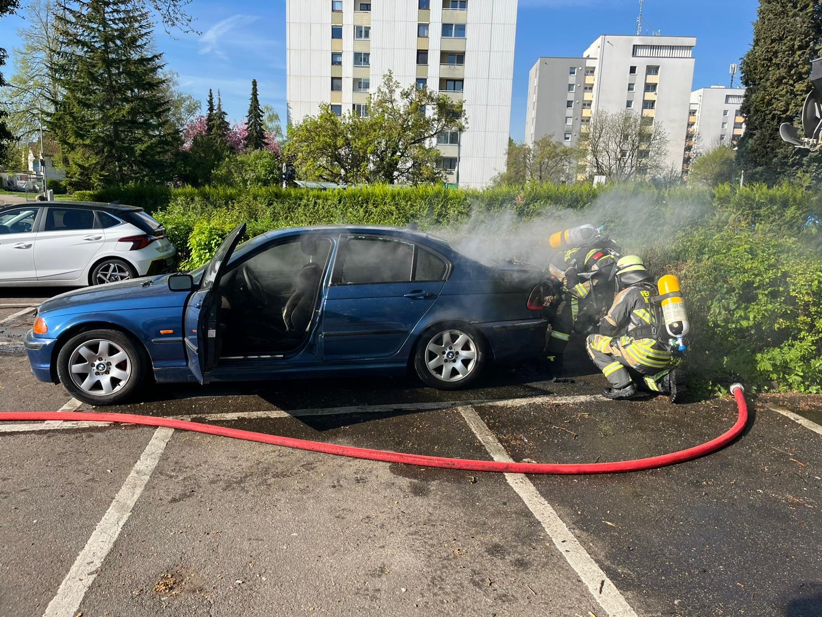 Die Feuerwehr Neckarsulm wurde am 17.04.2026 durch die Integrierte Leitstelle (ILS) Heilbronn zu zwei parallelen Einsätzen alarmiert. Um 09.19 Uhr ging es zunächst zu einem gemeldeten Pkw-Brand in die Amorbacher Straße im Bereich des AWO-Waldheims in Amorbach. Bereits auf der Anfahrt war eine starke Rauchentwicklung sichtbar. Vor Ort stellte sich heraus, dass ein Pkw auf einem Parkplatz im hinteren Bereich und eine Hecke brannten. Der Angriffstrupp konnte den Brand mit einem C-Rohr zügig löschen. Anschließend wurde das Fahrzeug mit der Wärmebildkamera auf weitere Glutnester überprüft.