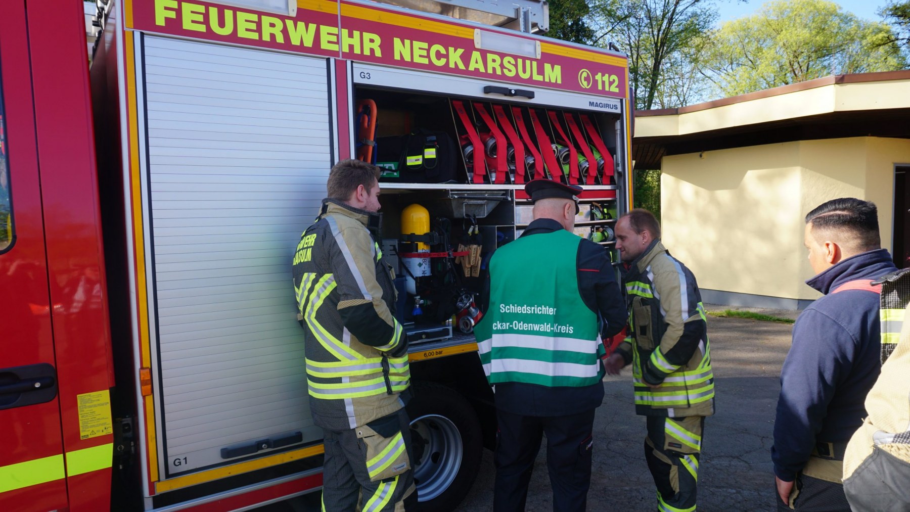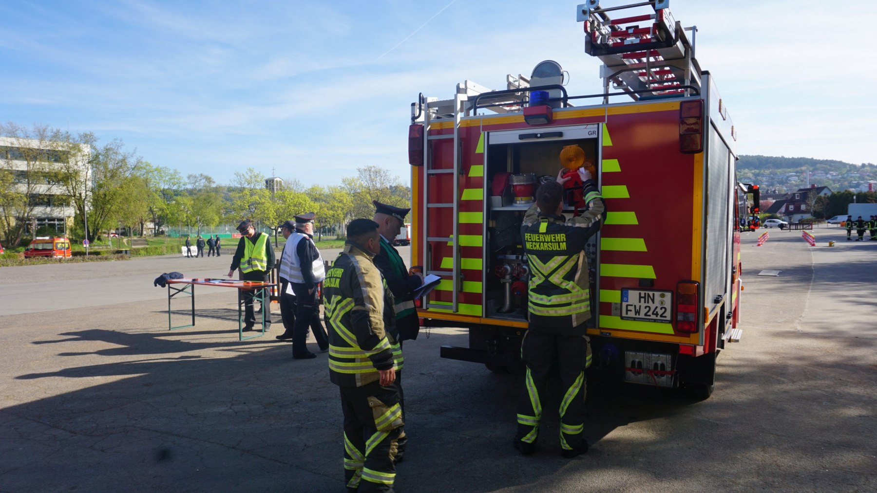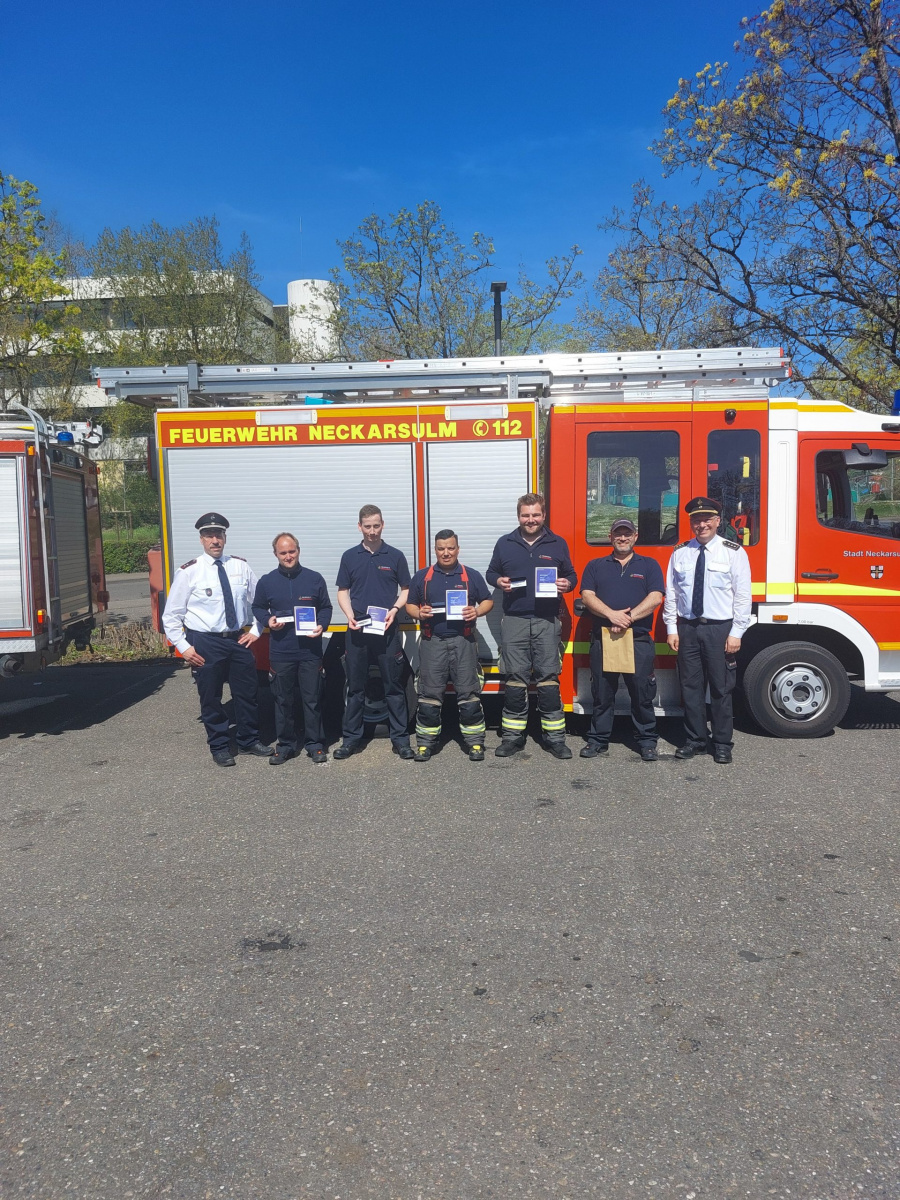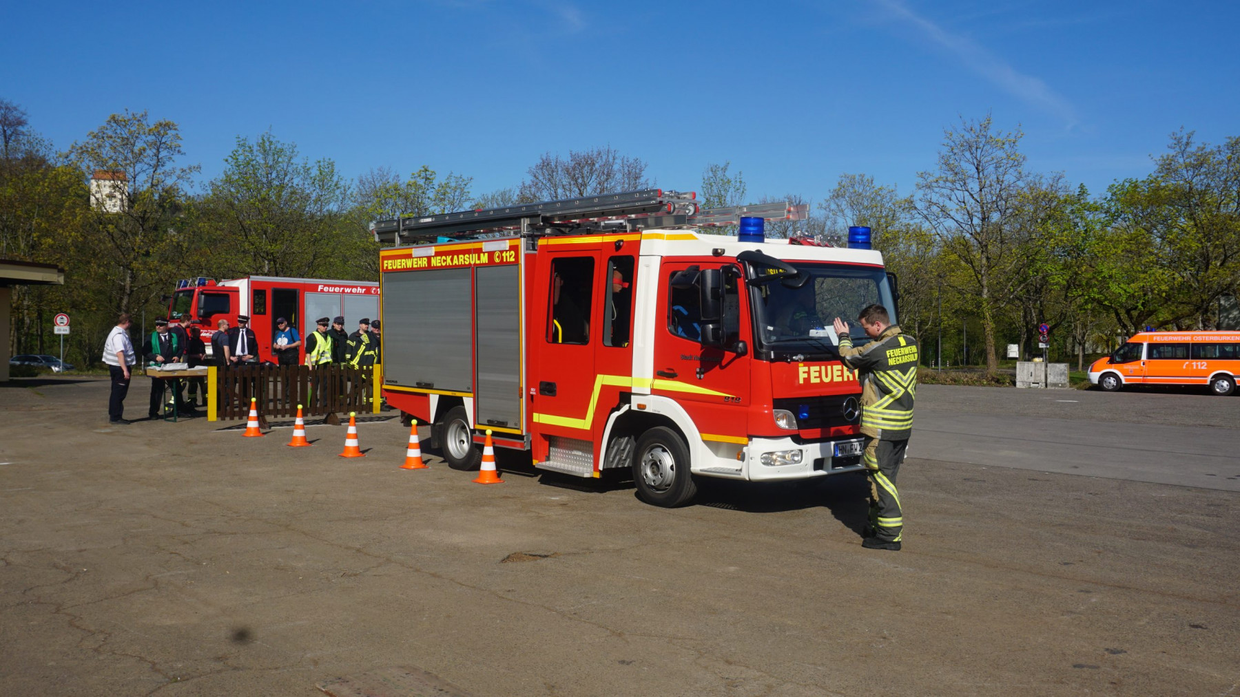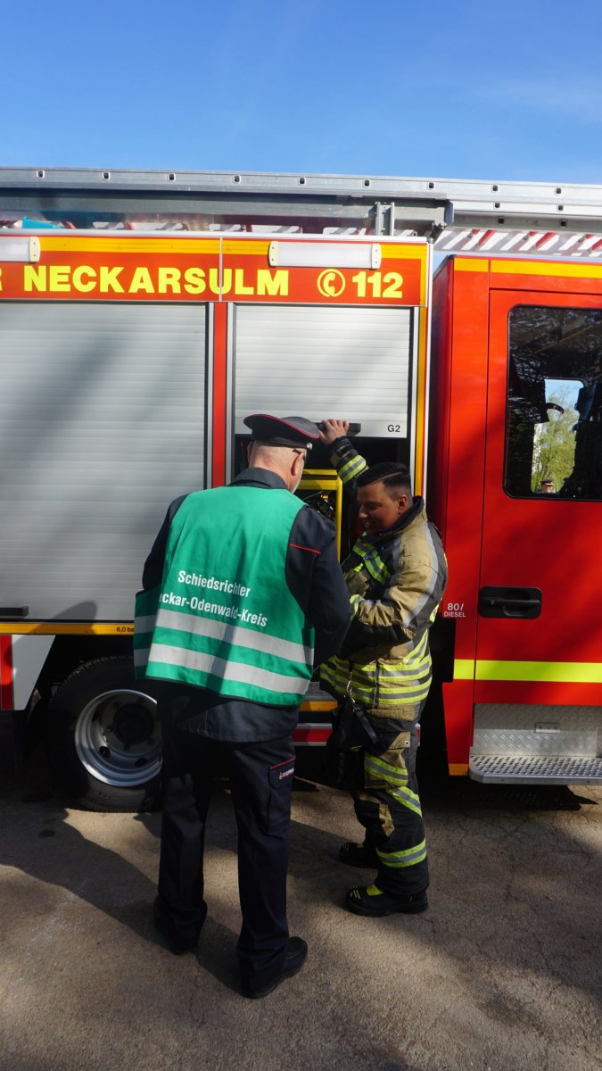 Im Anschluss an die Veranstaltung in Heilbronn trafen vier Fahrer am 12. April in Mosbach Neckarelz ein, um ebenfalls an einem anspruchsvollen Prüfprogramm teilzunehmen. Mit der Begrüßung durch den Kreisbrandmeister des Neckar-Odenwald-Kreises – Jörg Kirschenlohr – begann der Tag mit einer Theorieprüfung, wieder gefolgt von der praktischen Übung, in der der sichere Einsatz des Löschgruppenfahrzeugs erneut unter Beweis gestellt wurde. Alle Fahrer meisterten die Prüfungen. Auch hier wurden die Abzeichen feierlich überreicht, wobei KBM Kirschenlohr gemeinsam mit Landrat Dr. Achim Brötel ihre Anerkennung für den Erfolg der Teilnehmer aussprachen.