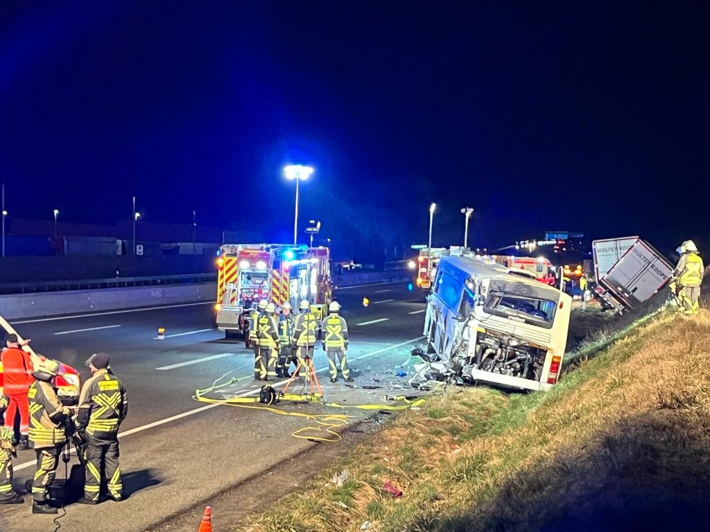 Vermeintlich durch einen Reifenplatzer fuhr ein LKW auf der A6 in Fahrtrichtung Nürnberg in einen auf dem Standstreifen stehenden Reisebus. Hierbei wurden der Reisebus wie auch der LKW stark beschädigt.