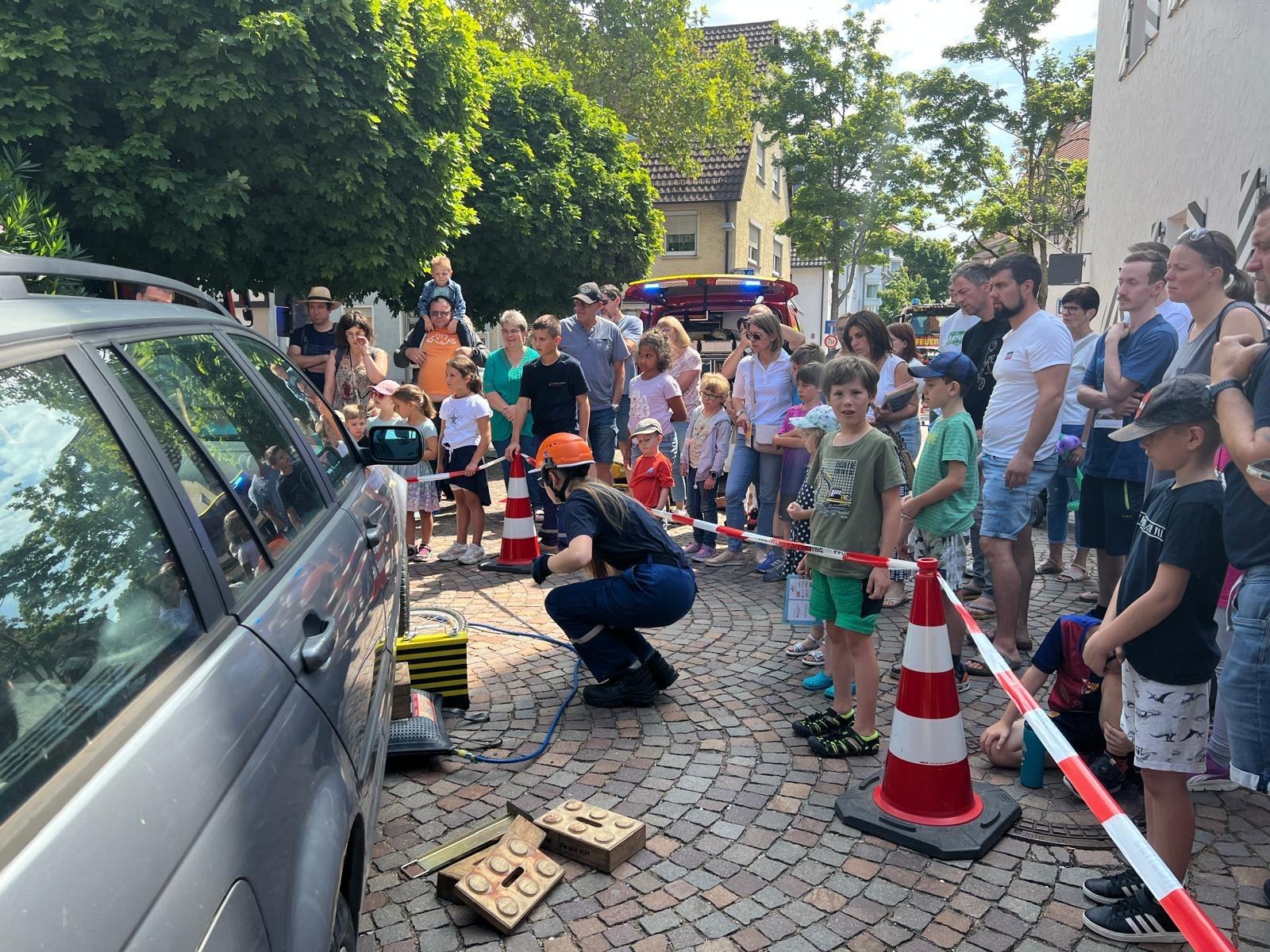 Ab 11.45 Uhr fanden stündlich die Schauübungen der Jugendfeuerwehr statt. Bei den Übungen wurde ein Unfall zwischen einem Auto und einem Fahrradfahrer simuliert. Mit Hebekissen und Unterbauhölzern wurde der Patient (Dummy) unter dem Fahrzeug gerettet und anschließend an den Rettungsdienst übergeben.