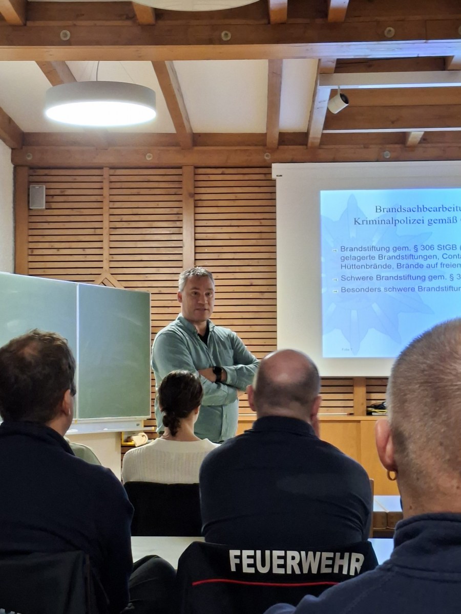 Im Rahmen ihres Fachvortrags erläuterten die beiden Referenten, wie Feuerwehr und Polizei bei Ermittlungen zu Brandstiftungen zusammenarbeiten und sich hierbei gegenseitig unterstützen können. Sie erwähnten beispielsweise, dass bei einer so komplexen Sachlage jedes Detail von Bedeutung sein kann und deshalb auch die Trupps, die z. B. im Innenangriff tätig waren, anschließend vernommen werden können. Dies ist äußert wichtig, da sie Eindrücke vom direktem Brandgeschehen haben, die später sonst nur noch schwer nachvollziehbar sind (Schließzustand einer Tür, verstellte oder verschlossene mögliche Flucht- bzw. Rettungswege usw.).