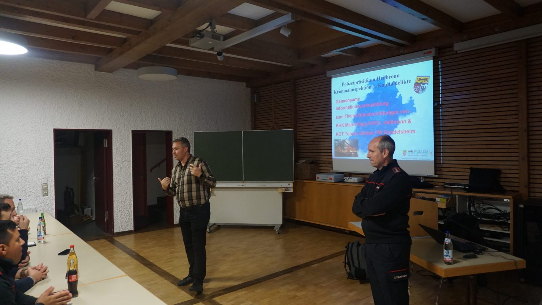 Am 7. und 14. November hielten Kriminalhauptkommissar Mario Rapp vom Polizeipräsidium Heilbronn und der Kommandant der Feuerwehr Gundelsheim, Tobias Gärtner, einen Fachvortrag zum Thema Brandermittlungen. Geladen waren alle Mitglieder der drei Einsatzabteilungen sowie einige Kameraden der Feuerwehr Erlenbach. Der Vortrag entstand im Jahr 2021 aus einer gemeinsamen Initiative von Polizei und Feuerwehr im Rahmen der Aufarbeitung der größten Brandstiftungsserie der Nachkriegszeit in Gundelsheim im Jahr 2020.